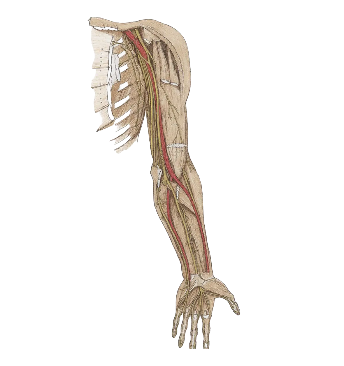 The median nerve travels from the neck through the shoulder, forearm, and wrist — restoring freedom along the whole pathway is essential for lasting relief. Anatomy Plate (Gray’s, 1918)