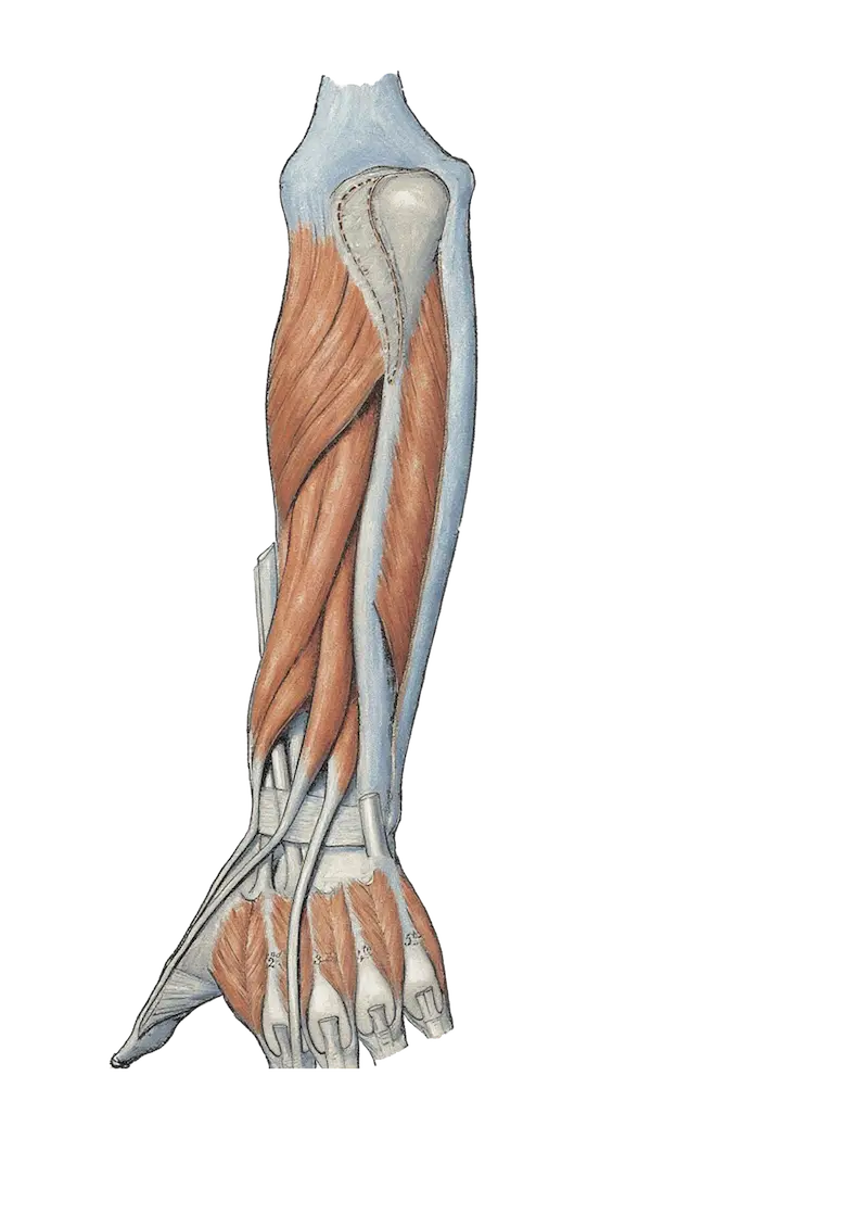 The first half of the session focuses on releasing global tension patterns — ribs, shoulder girdle, diaphragm, hips — to reduce strain traveling down the arm. In the second half, we work through the forearm flexors and extensors, biceps, triceps, and the tendon attachment sites using pressure that matches your tolerance and clinical presentation.
