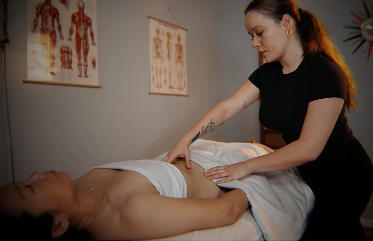 Treatment focuses on releasing tension and restoring balance in related areas—hips, glutes, adductors, abdomen, and lower back—to relieve strain on the pelvic floor. We also work directly on the external pelvic floor muscles through the drape to restore balance and coordination with surrounding tissues.