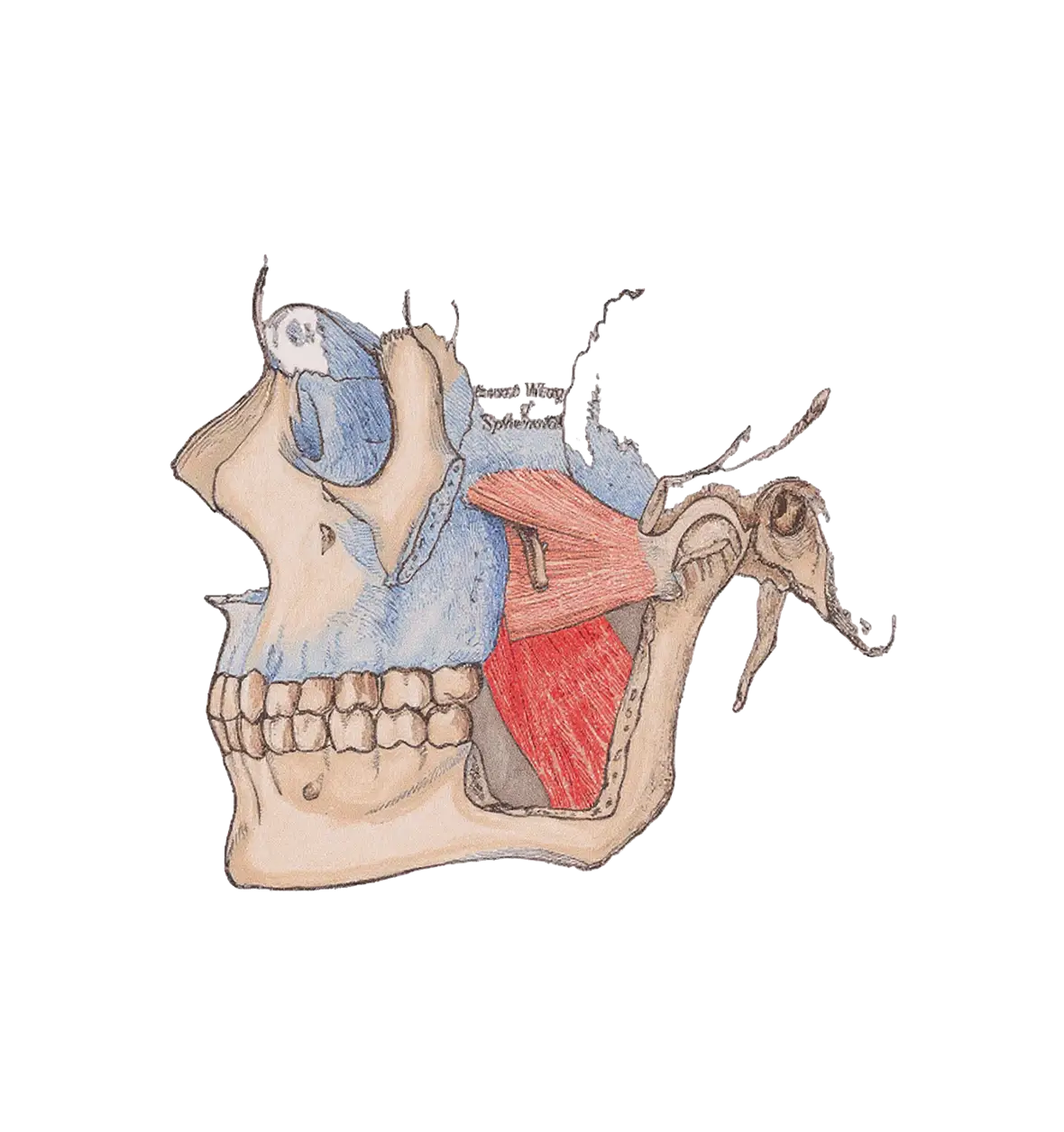 The lateral and medial pterygoids, two of our 4 jaw muscles, can only be accessed and worked on from inside the mouth. These are often completely locked and immobile in TMJ clients and releasing them can be profoundly impactful. Anatomy Plate (Gray’s, 1918)